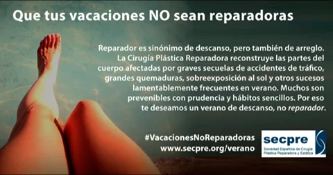 Coincidiendo con el inicio del verano, la Sociedad Española de Cirugía Plástica, Reparadora y Estética (SECPRE) ha puesto en marcha la campaña online #VacacionesNoReparadoras para concienciar a los ciudadanos sobre la gravedad de algunas de las lesiones que más deben atender los profesionales de cirugía reconstructiva en verano: los accidentes de tráfico, los incendios y otras causas de quemaduras y la sobreexposición al sol.